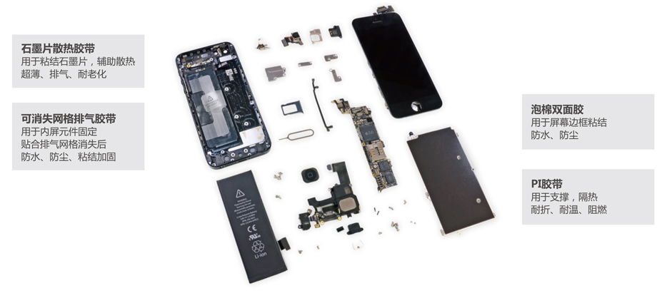 以PI黄膜为基材表面经过黑色油墨处理制成的单面胶带,具有优异的粘着性能和良好的绝缘性,耐温性能良好,易于模切。适用于电子产品各部件之间的粘接与补强。